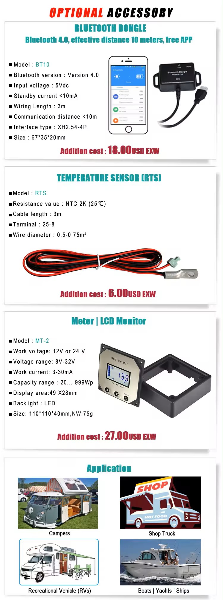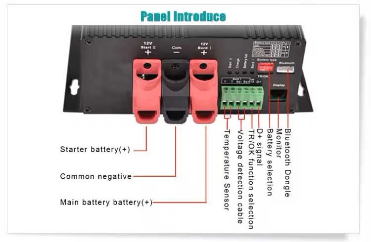 Model:IPS-B2B1230 ① DC INPUT:12V Battery (10.5-16VDC ) ② DC OUTPUT:GEL (14.3V),Sealed (14.4V),Flooded (14.7V),LifePO4(14.6V) ③ Charging current:30A ④ Size: 190*194*70MM ⑤ Weight:1.44KG ⑥ Material of shell:Aluminum ⑦ HS code: 8504409999 ⑧ Accessories:Monitor(MT-2)Bluetooth Dongle(BT10)Temperature Sensor(TRS)